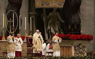 The seventh candle could be used for Pontifical High Mass when celebrated by an Ordinary in his diocese (or by the Pope anywhere, of course). The seventh candle, placed in the middle and in line with the other six, but it should be a little higher. This pushes the crucifix a little out of line… which also emphasizes it, in my opinion. Pope Benedict is acutely sensitive to the position of the Cross during Holy Mass.