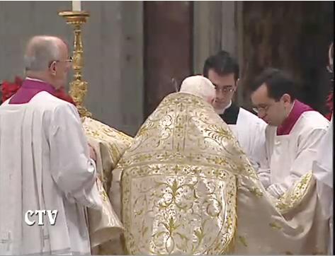 Where on earth did they dig up that infernal choral version of the Te Deum they’re botching? If they’d stuck with Gregorian chant they’d have been done in a quarter of the time, and the Holy Father wouldn’t have had to stand there wearing what’s obviously a rather heavy cope through the whole thing. Methinks HH will be having a few choice words with the kappelmeister afterwards…if he manages to survive this liturgy.
