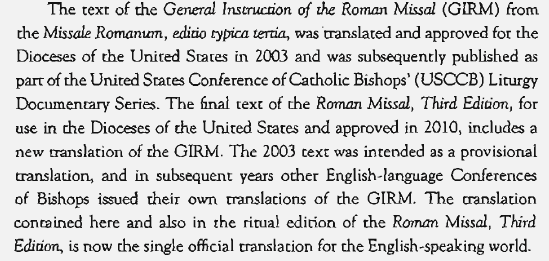 People have been applying the GIRM not as stated in Latin, but as interpreted in the provisional 2003 translation, which the new Roman Missal will state is superseded by the new translation, which will now be the single official English translation of the GIRM for the English-speaking world.