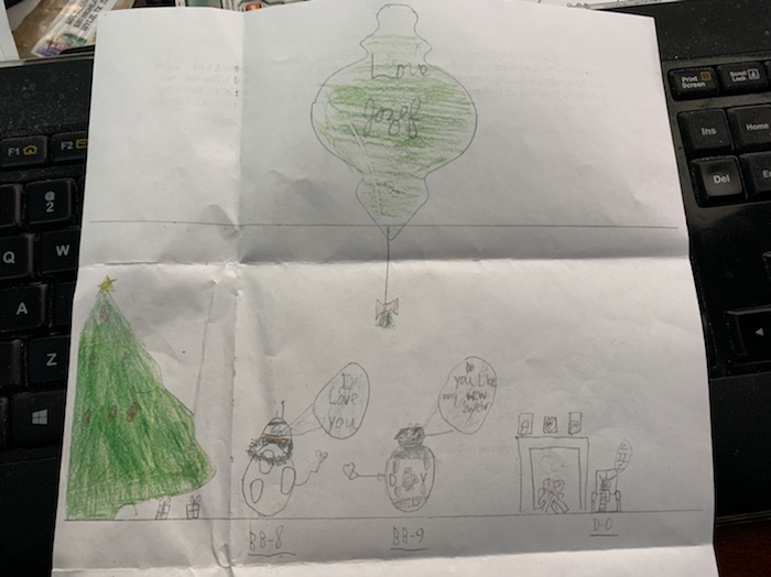 And I think we have a … spaceship?… and… affectionate robots exchanging gifts? One of them got a new sweater. As all good robots do at Christmas.