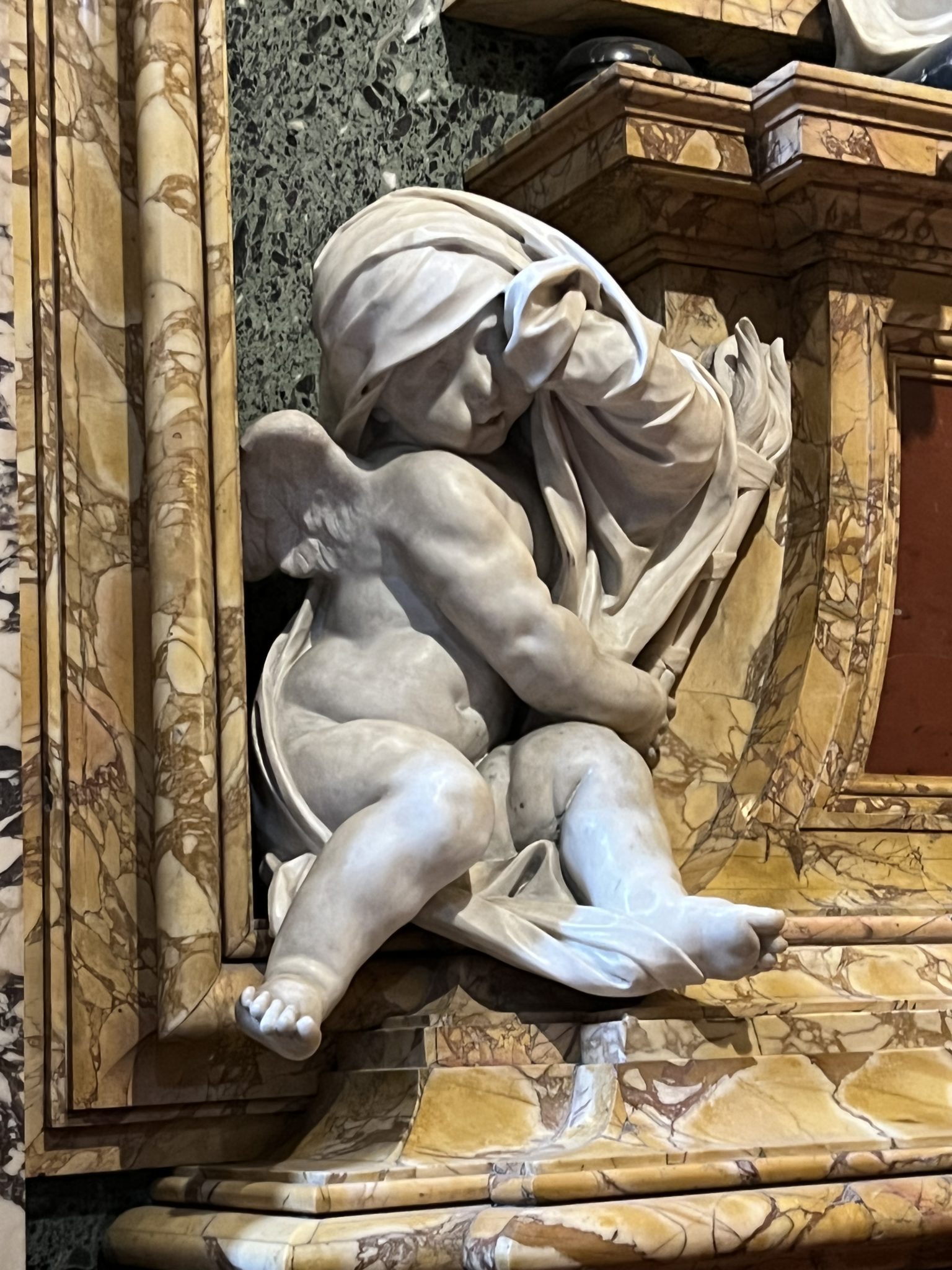 So far I’m not having much luck finding out more about the monuments beyond their being of Angelo Altieri and his wife Vittoria Parabiacchi, whose bust was started by Michel Maille in 1699 who abandoned work on it in April 1701 whereafter it was completed by Giacomo Antonio Lavaggi, and that both are in the first chapel on the left with a bas-relief altarpiece by Lorenzo Ottonidepicting the Holy Family and Blessed Ludovica Albertoni by Lorenzo Ottoni – with the site chosen for this church including the location of the house where Ludovica Albertoni had lived. But more about ‘Nihil’ and ‘Vmbra’? Not a thing, yet… (!)