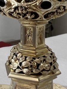 In a flash, a priest, a cardinal, and a layman (diplomat), combined independently but in utter coordination to bring everything to pass. That morning, I had that same chalice, newly re-gilded, consecrated by Card. Pell (shortly before his death). As I explained to him the elements of the chalice, I recounted St. Thérèse’s intercession. I was then given a lift by that same cardinal to church so I could say a private Mass for a layman’s lovely family. I used the newly re-consecrated chalice, of course, and at the main altar where after ordination I had said my third Mass with it over three decades before. That same day I had a meeting with my bishop, very difficult to attain without my priest friend’s help. My lay friend – for some reason not incredibly busy that day – gave me a ride. On the way, I again mentioned the help of St. Thérèse decades before. The meeting was excellent.