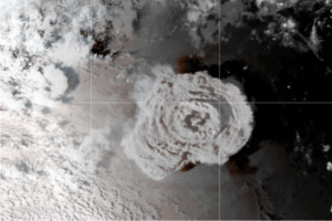So, why has atmospheric water vapor increased so dramatically? Because of a historic, gigantic volcanic eruption last year that I – probably along with you — had never heard of. The mass media ignored it because it took place 490 feet underwater in the South Pacific. Don’t take it from me, take it from NASA (and please do follow the link to see time lapse satellite imagery of the underwater eruption and subsequent plume of gasses and water injected into the atmosphere):