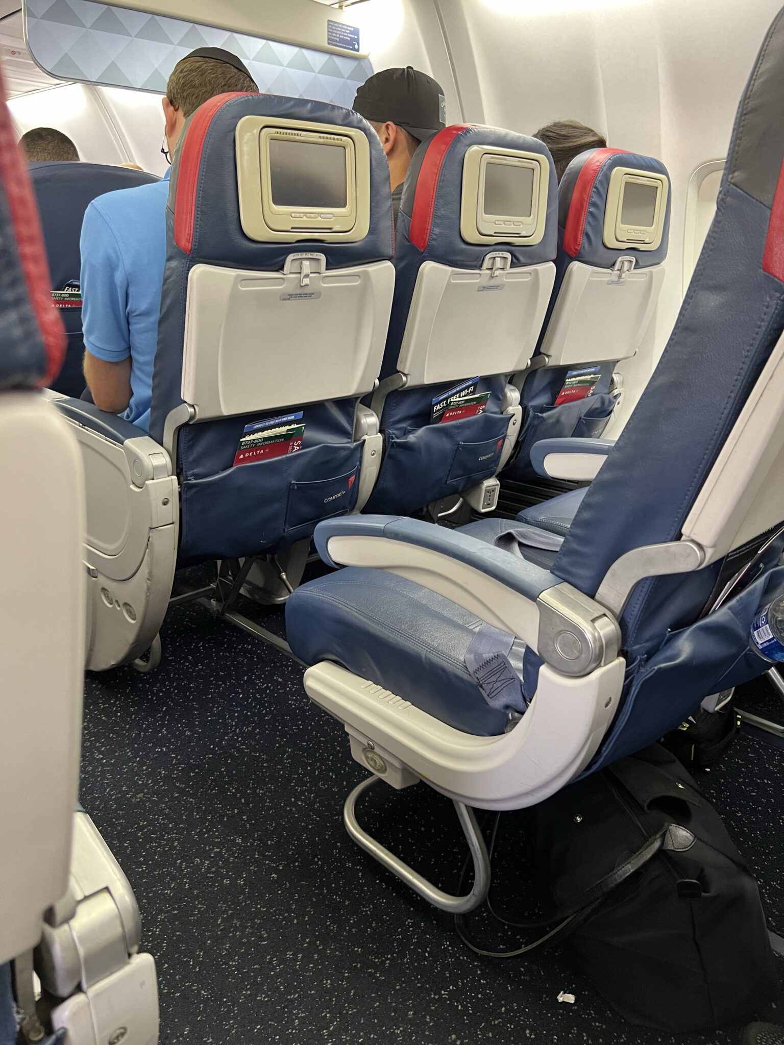 Boarding chaos. One lady wanted a seat not assigned to her and blocked the aisle for sometime. 10 wheel chairs. Although it is a completely filled flight, this row is still empty which is odd. Someone didn’t make it.