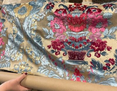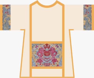 The idea is to make something in the style of our existing green solemn, namely damask and inserts from a stunning velvet fabric and short bushy fringe edging. In this case, the base damask would be white(ish) and the velvet would be kinda goldy with some red and blue in the pattern.