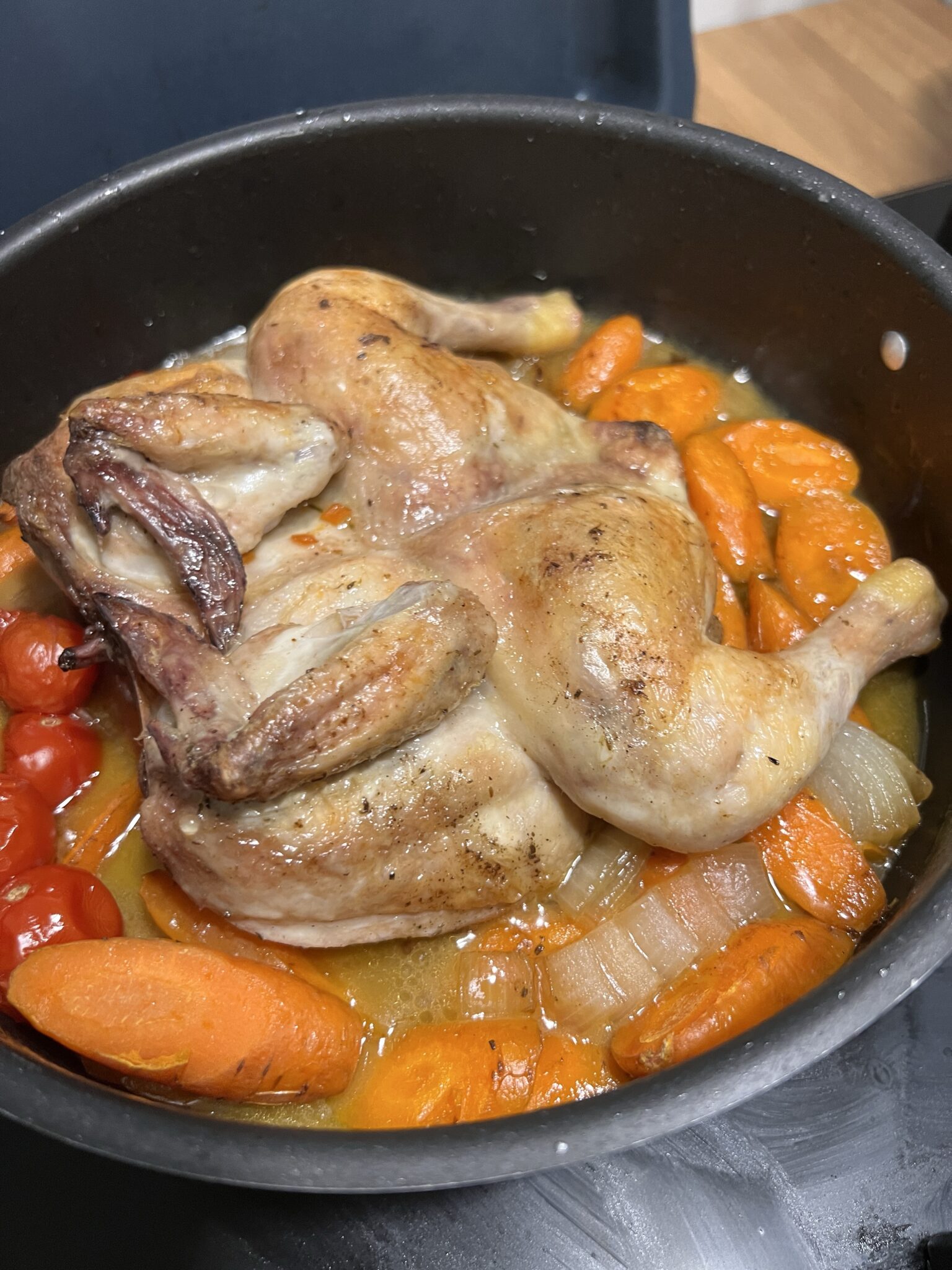 …chicken. I really like the chicken here because it tastes like chicken! You know what I mean. Spatchcocked galetto, onion, carrots, a few tomatoes, a little white wine.