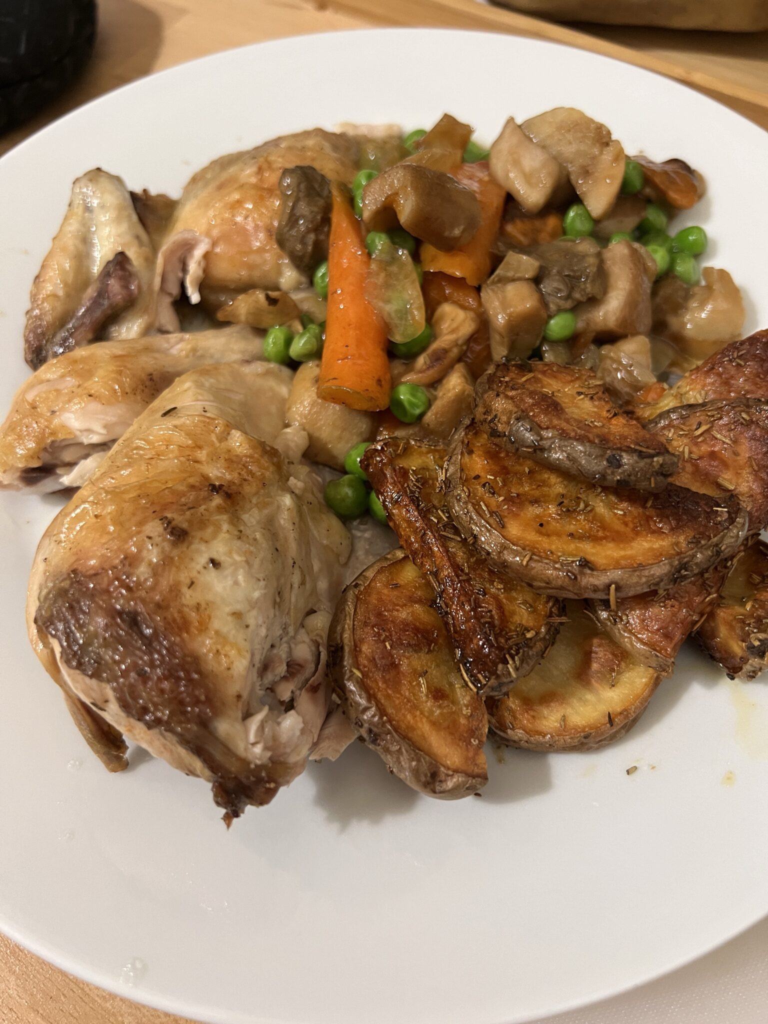 Having extracted the chicken from the pan, I reduced the juice adding chopped porcini mushrooms and, at the last minute, baby peas. That stuff in the front right: slightly over-done but delightfully crunchy oven-roasted potato slices.