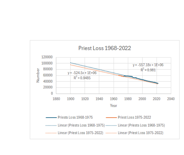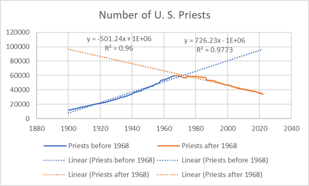 As you can see, the rise in priest numbers is almost exactly linear until 1967 (the increase is in spite of the normal number of priests who retired or died the previous year and in spite of everything going on in society during 1920 – 1950). In 1968, there was an inflection point and the slope of the graph changed overnight to negative. The rising slope is 1.4 times faster than the falling slope (726 vs. -501 per year), so as of 2022 (the last year I collected data), we were back at the same number of priests as in 1942. I have provided below a table of priest numbers from 1960 to 1975 for anyone who might be interested (the full table is available upon request). In fact, the Church in the U. S. lost 2260 priests from 1968 to 1975. One can argue as to the cause, but something happened in 1967/1968 that started this trend. There is only one realistic possibility that influenced both society as a whole and priests, specifically: the issuance of the document, Sacerdotalis Caelibatus, by Pope Paul VI in 1967 that provided a path for priests to become laicized. This is the only cultural shift in 1967 that affected priests qua priests.