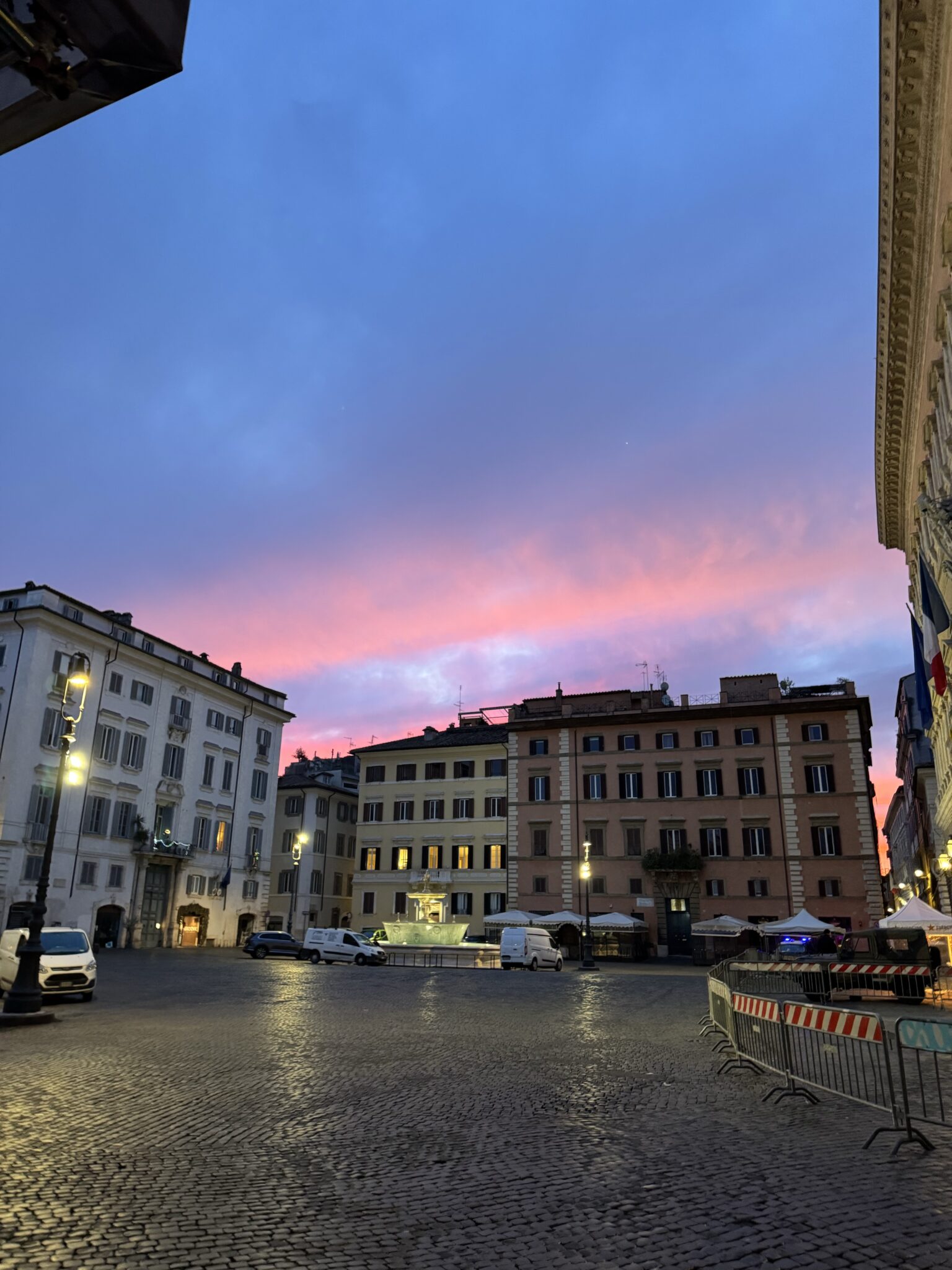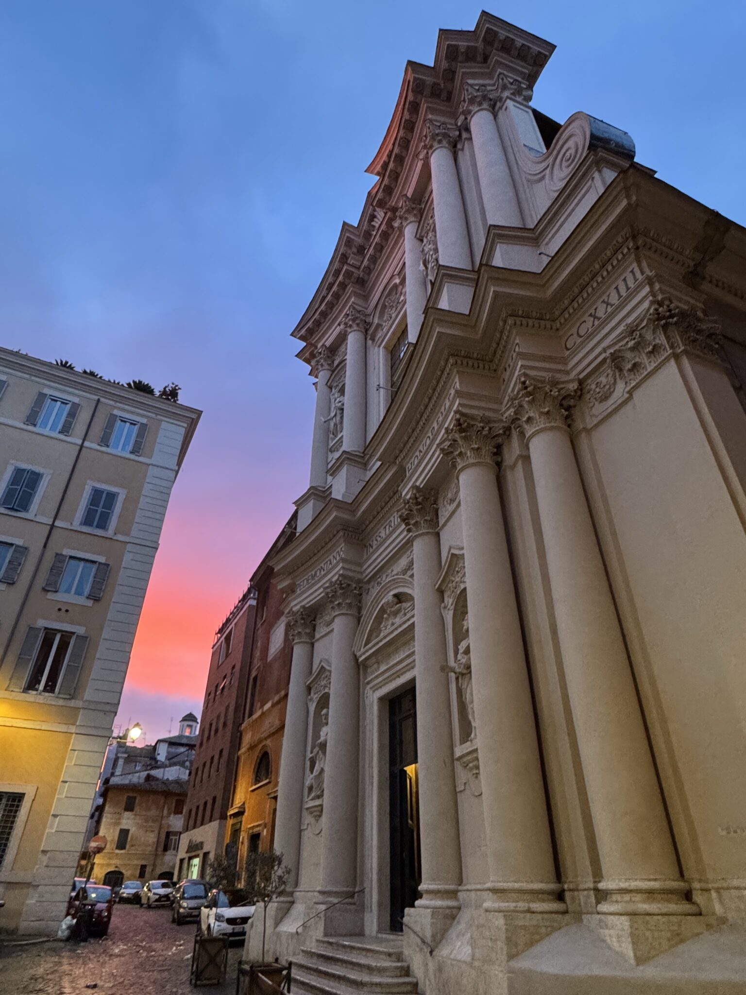 Being up with the sun has some benefits. The walk to church and the still drowsy Piazza Farnese.