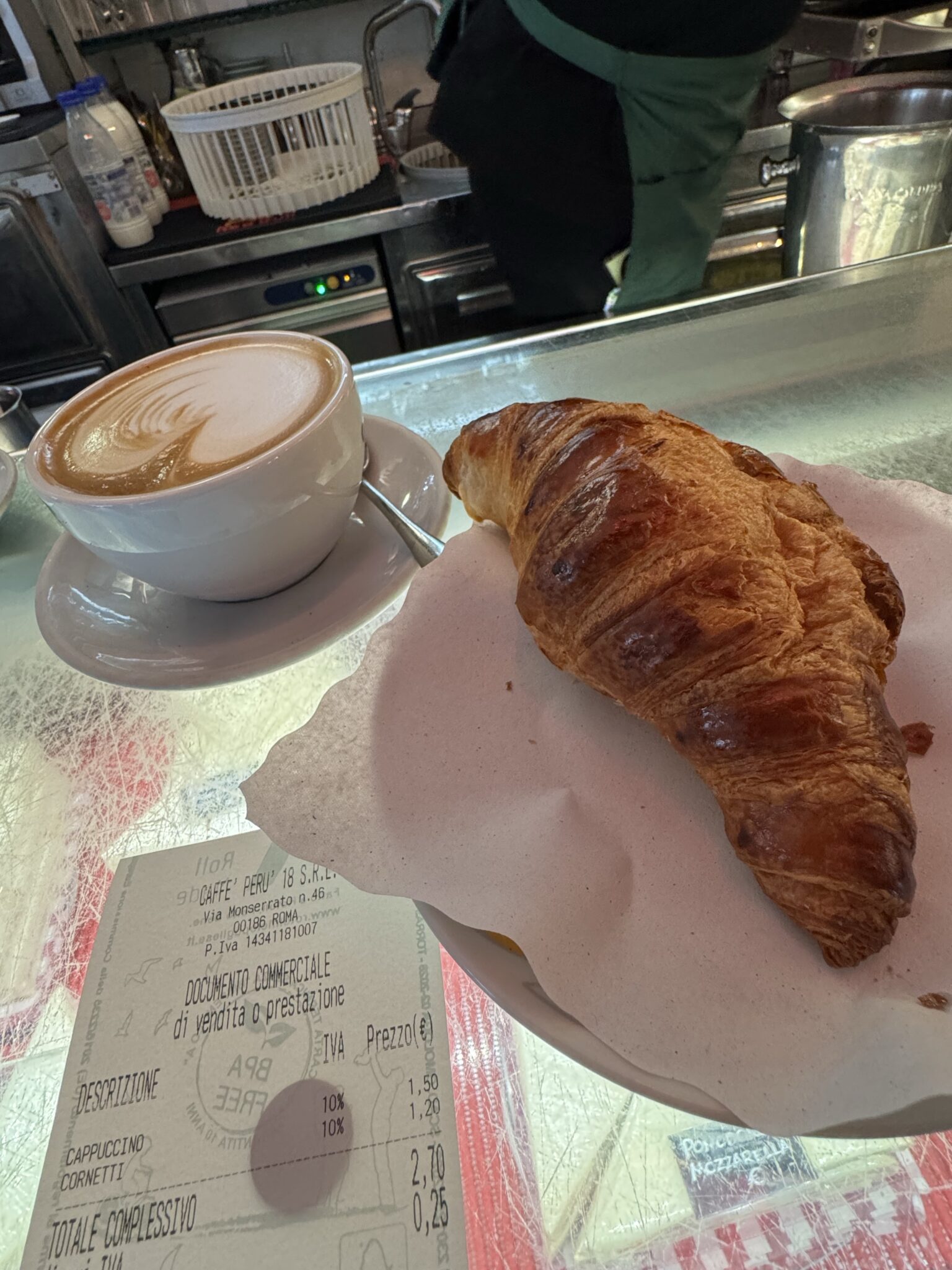 Breakfast. I’ve been eating more protein in the mornings, but you have to have a cornetto in Rome once in a while.