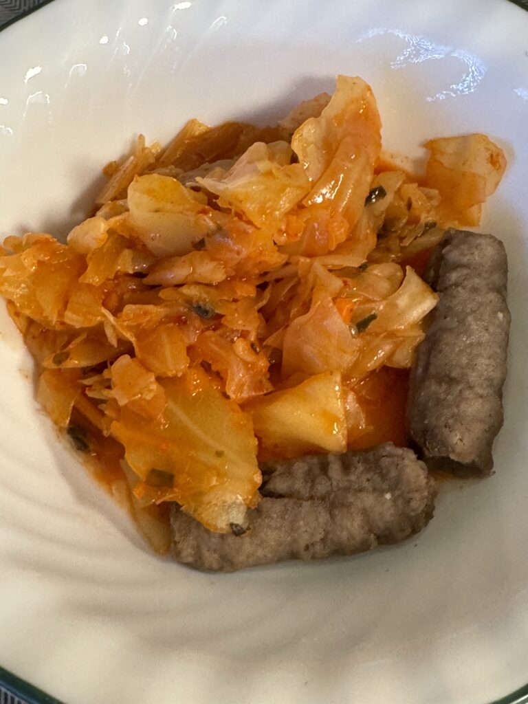 Kimchi. Breakfast of Champions. Oh yeah… a couple little breakfast sausagey things, not old cigar buts. I reserve them for special feast days.