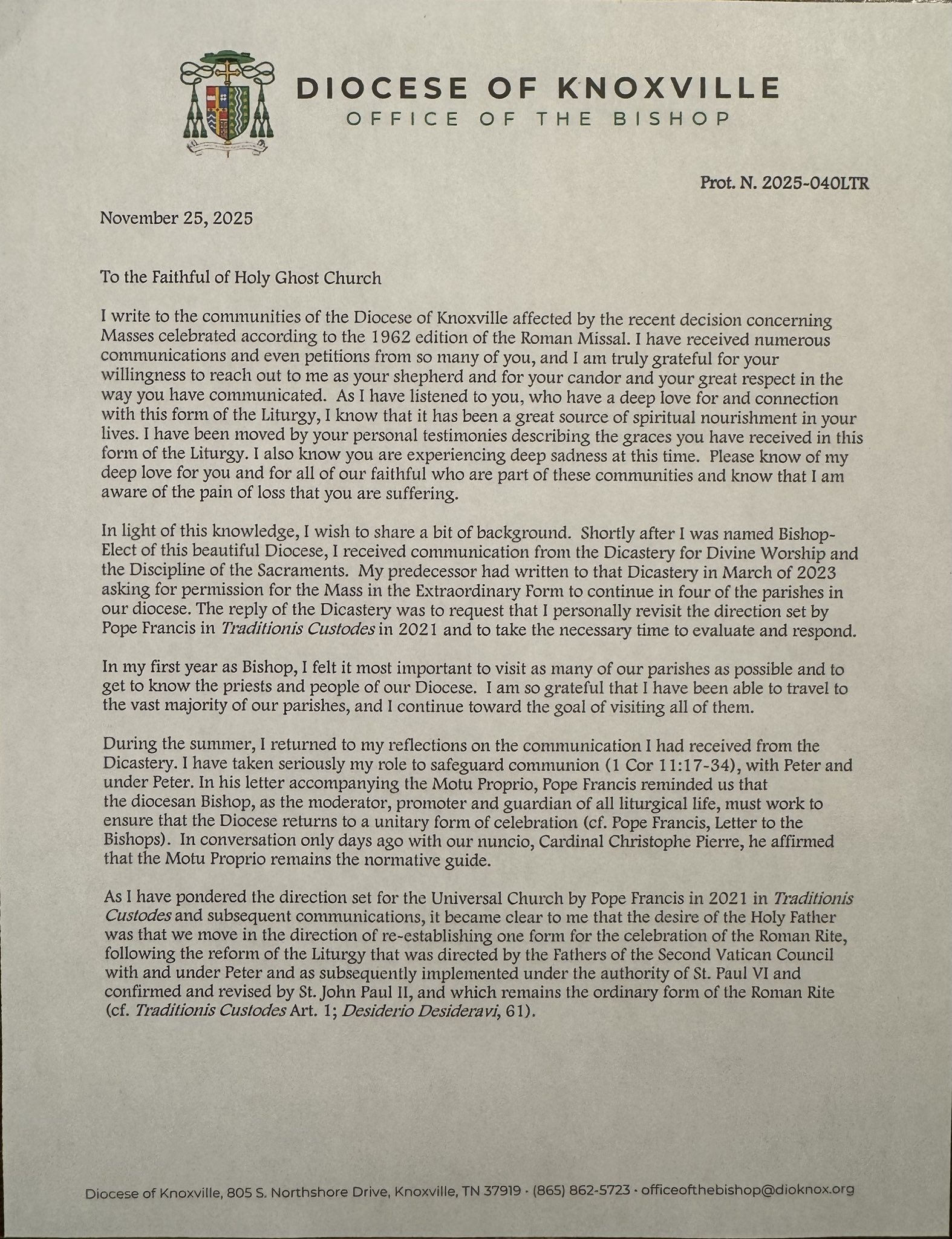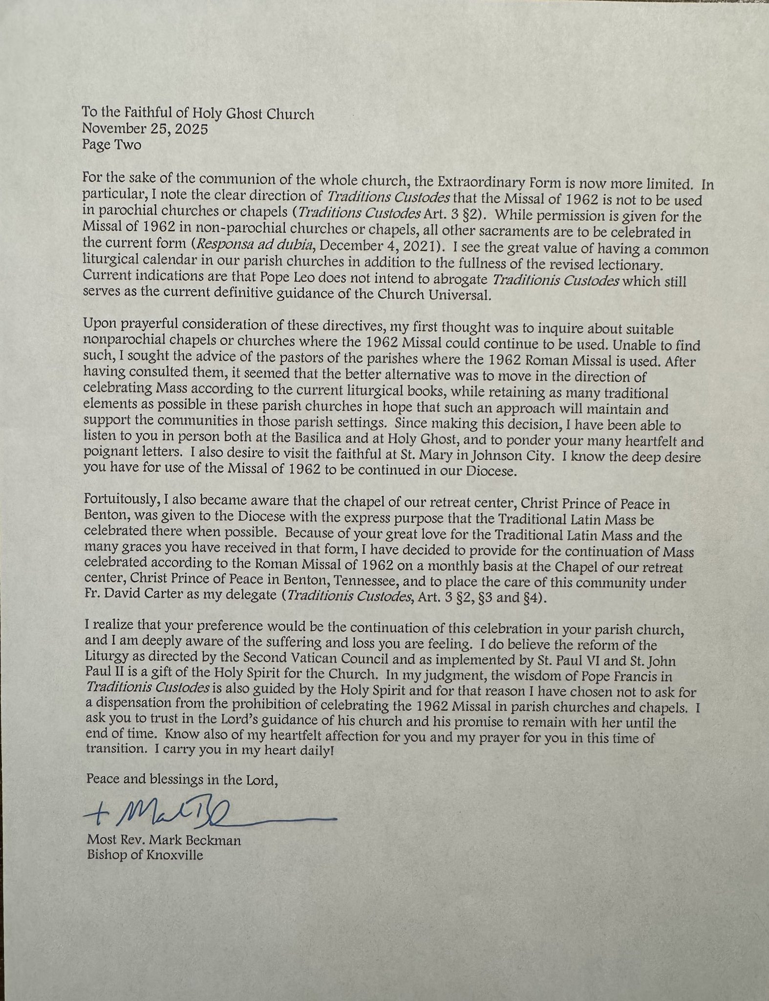 I have decided to provide for the continuation of Mass celebrated according to the Roman Missal of 1962 on a monthly basis at the Chapel of our retreat center, Christ Prince of Peace in Benton, Tennessee, and to place the care of this community under Fr. David Carter as my delegate (Traditionis Custodes, Art. 3 §2, §3 and §4).