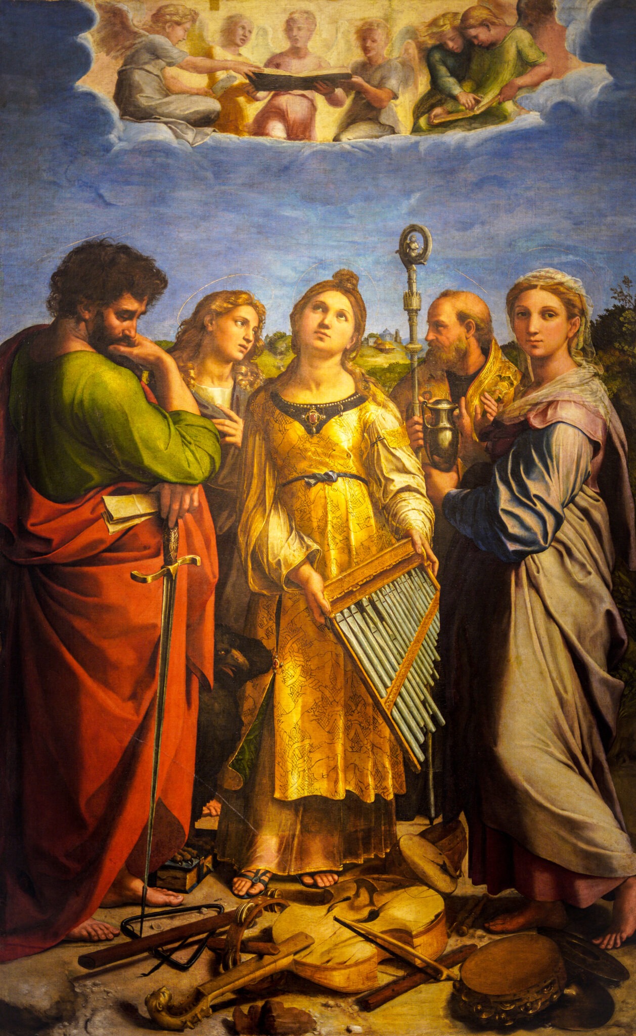 Cecilia is traditionally shown as the patroness of sacred music. In Raphael’s painting the musical instruments lie broken or discarded at her feet, the organ out of sorts slipping from her hands. Earthly music has fallen silent. Her gaze is lifted toward the harmony of heaven, which she is about to enter through martyrdom.