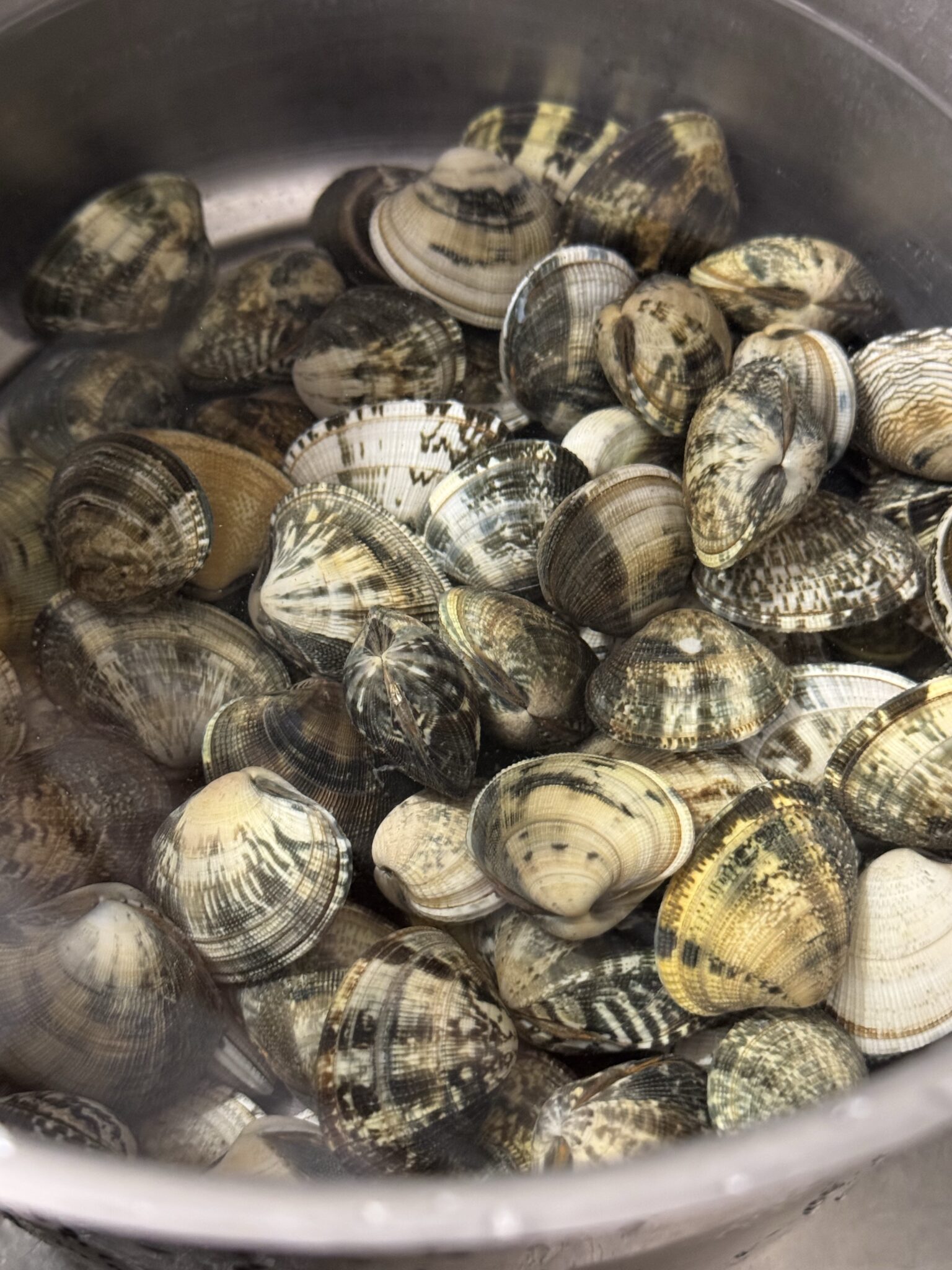 I purged the clams for hours in salty water. They say in the shop that they are already purged. Yeah… I purge them more.