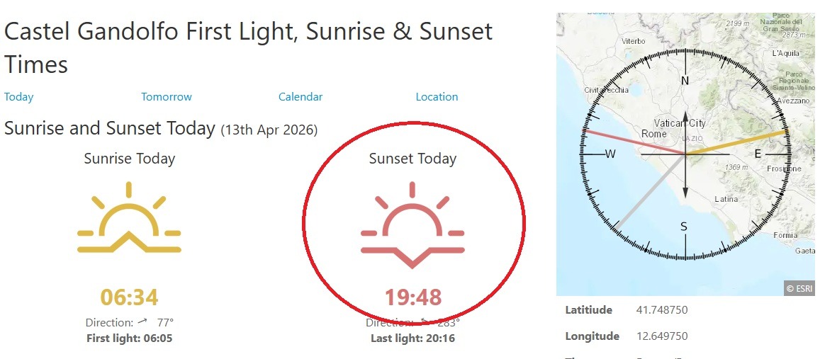 On the new Six Hour Clock App I wrote about yesterday, I have a slightly different time for sunset, that is, 19:48 – 3 minutes sooner than the curial calendar shows.  I suppose this could be a matter of the location where the calendar’s time was calculated.    I am going to guess that it is calculated not in Rome, but at Castel Gandolfo, the summer papal palace but also the site of the Vatican Observatory.  And….
