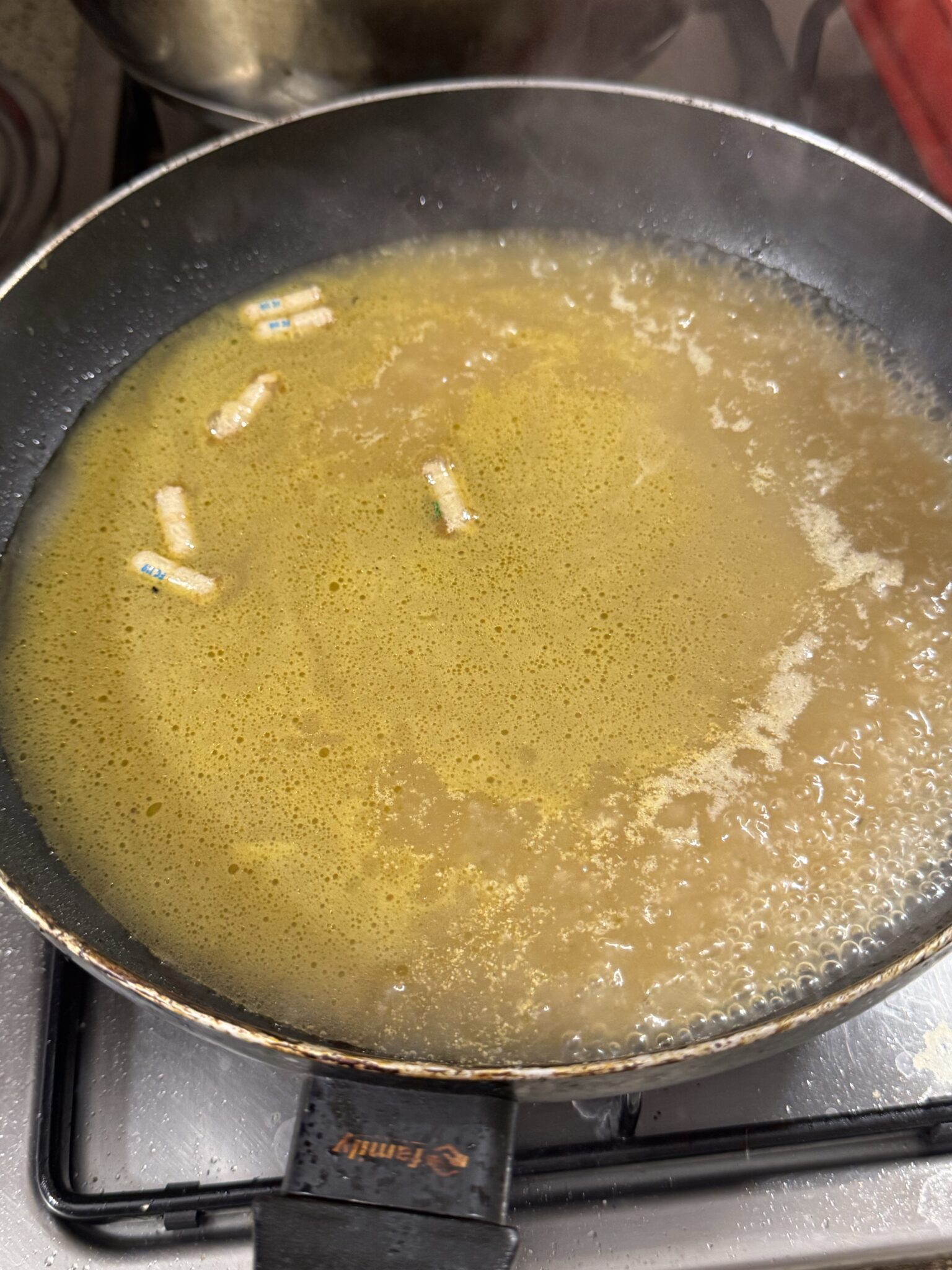 I wanted to thicken the liquid, but I don’t have any flour. However, I remembered once using a few psyllium capsules. Not quite the same, but in a pinch, improvise, adapt, overcome!