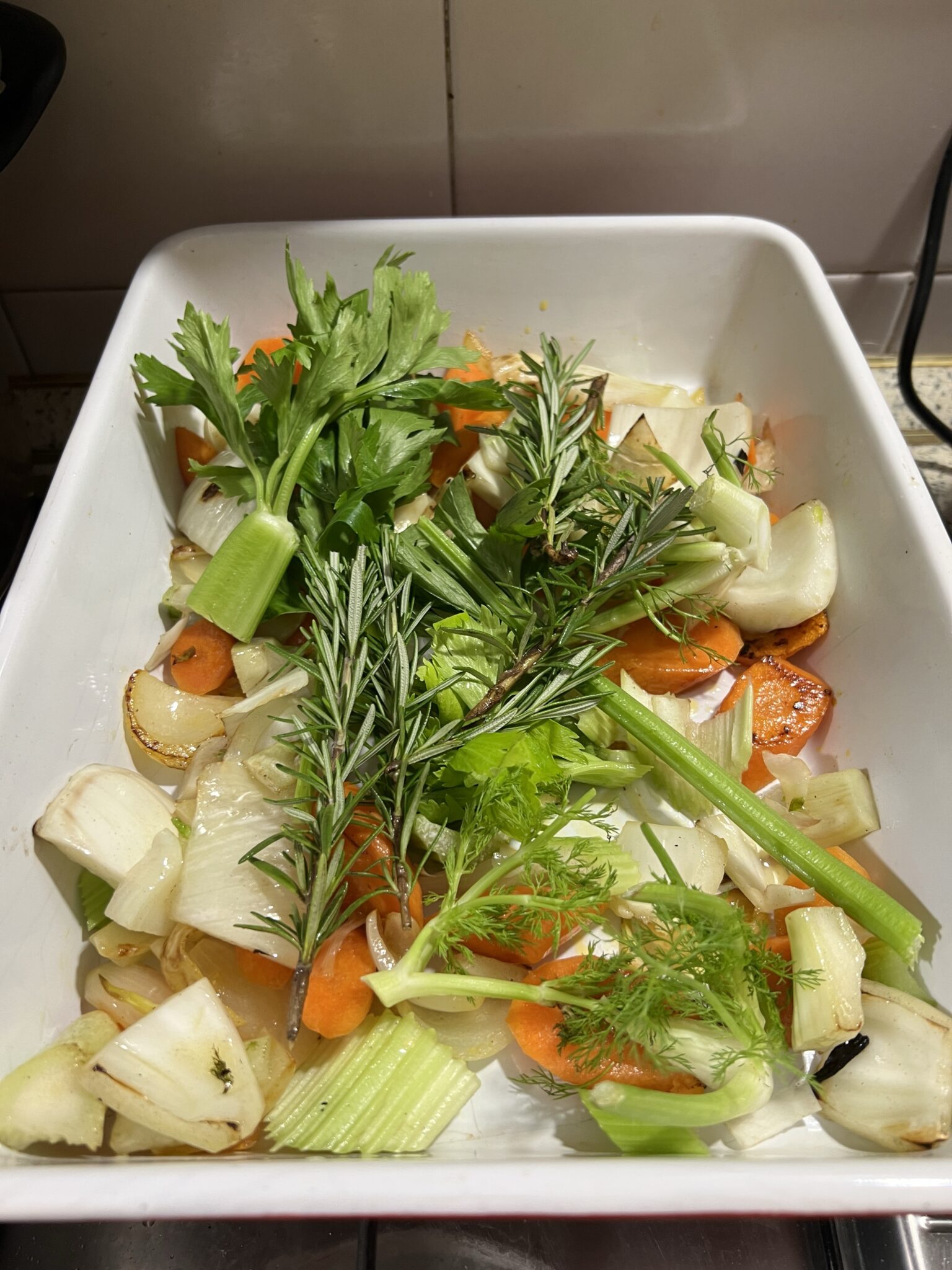 This was as good as I have ever made. The veg were celery, onion, carrot, fennel, garlic and lemon. The liquid, chix broth and white wine.