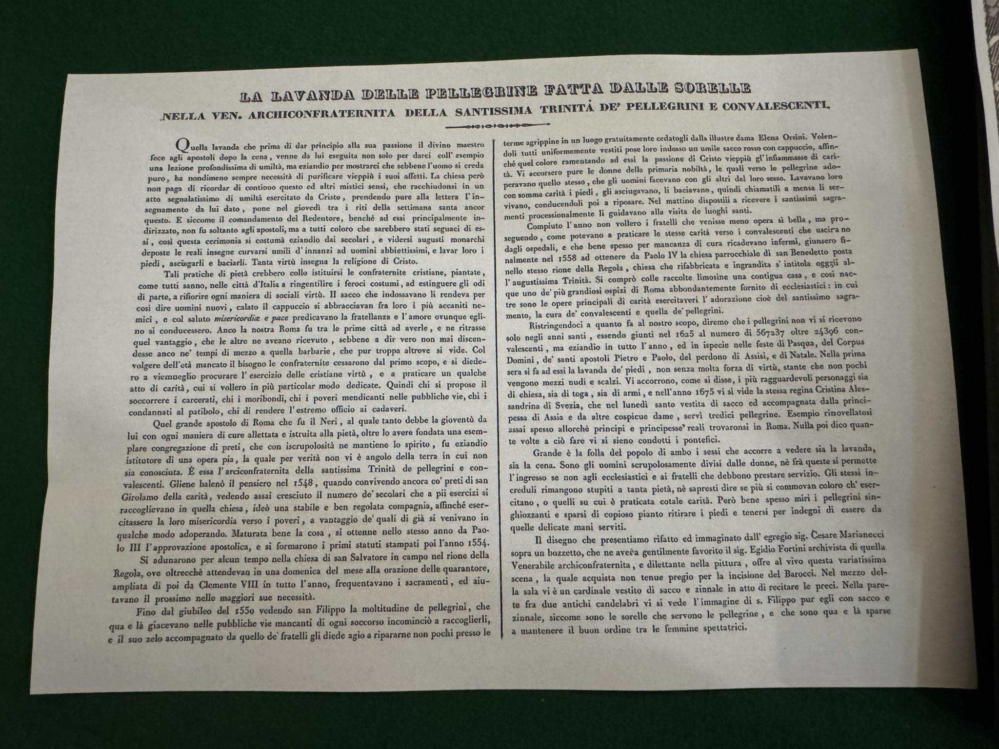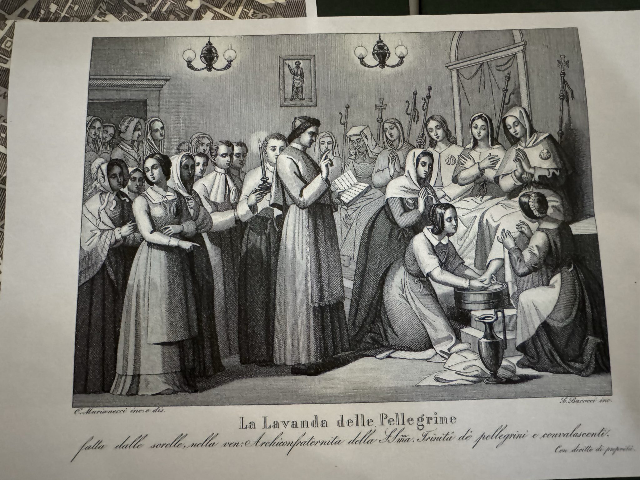 In this engraving, we see what the washing of feet of female pilgrims was like by the sisters in the Archconfraternity of The Most Trinity of the Pilgrims and Convalescents. The customs of the Archcon have been revived, although we don’t yet have a Cardinal member to preside. It’s amazing how the details are the same.
