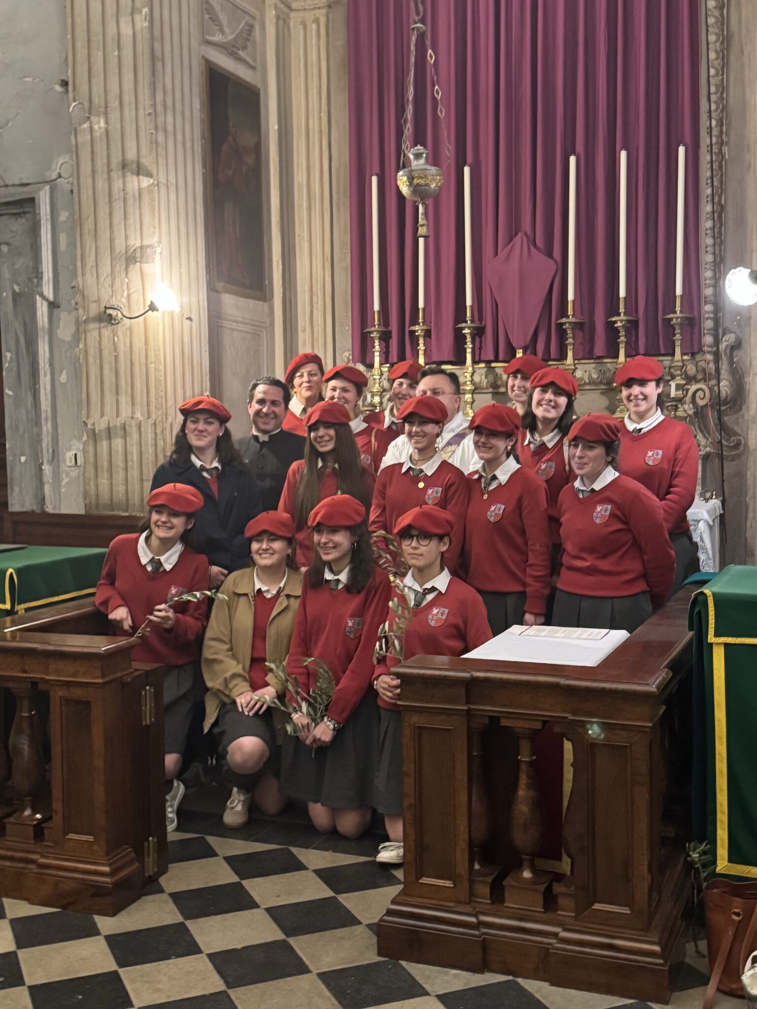 Yesterday a French priest brought a gaggle of school girls in cure birretes. I label this shot with the pastor in the middle, either rosa inter spinas or spina inter rosas.