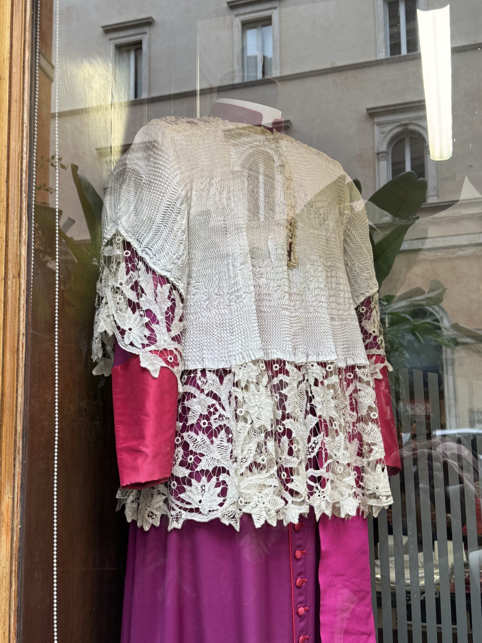 I went to Gammarelli today to sort out an order I put in last October and nothing was done. Today it got sorted. I wanted a red pianeta made with their “griffon” fabric. And now they have wider “column” trim in gold, which will be spectacular. Some of the over flow from the fund raiser will take care of the difference in the elevation of the trim.